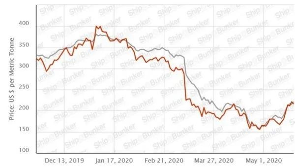 圖4 2019年12月中(zhōng)旬至2020年5月上旬期間,新加坡(pō)燃料油IFO380價(jià)格(紅線)與北海布倫特原油(yóu)價格(灰(huī)線)比較 來源(yuán)Ship & Bunker