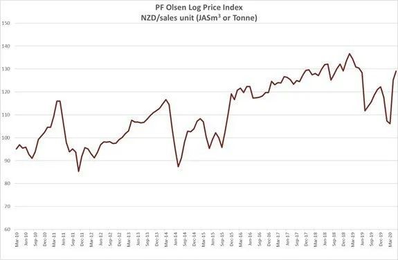 由(yóu)於原木出口價格的上漲,自2020年3月起(qǐ),PF奧爾森原木價格指(zhǐ)數(PF Olsen Log Price Index)已經上漲了23美元至(zhì)126美元。自4月開始,碼(mǎ)頭門價格(AWG prices)就沒有被提(tí)供,但自從重新開始上線後,原木(mù)的供(gòng)給就緊俏起來。