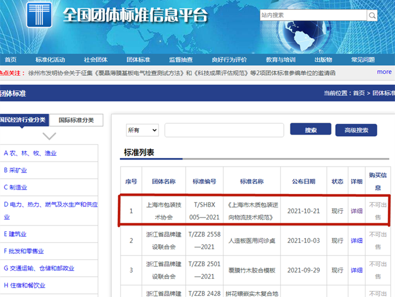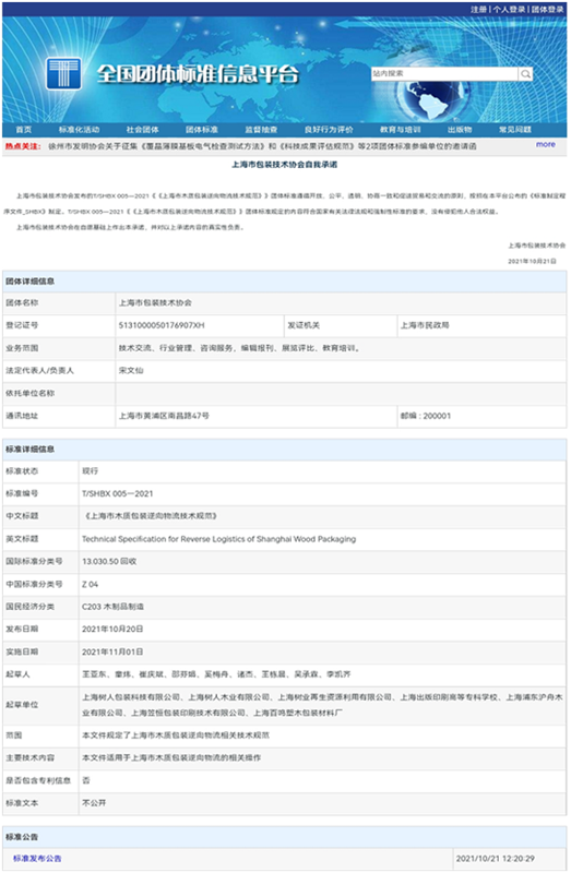 今天,全國(guó)團體標準信(xìn)息平台發布了編號為(wéi)T/SGBX005-2021的“上海市木質包裝逆(nì)向物流(liú)技術規範”,這(zhè)標誌著由上海樹人包裝科技有限公司會同母公司樹人(rén)木業(yè)共同牽頭(tóu)製訂的這項團標得以正式發布實施。